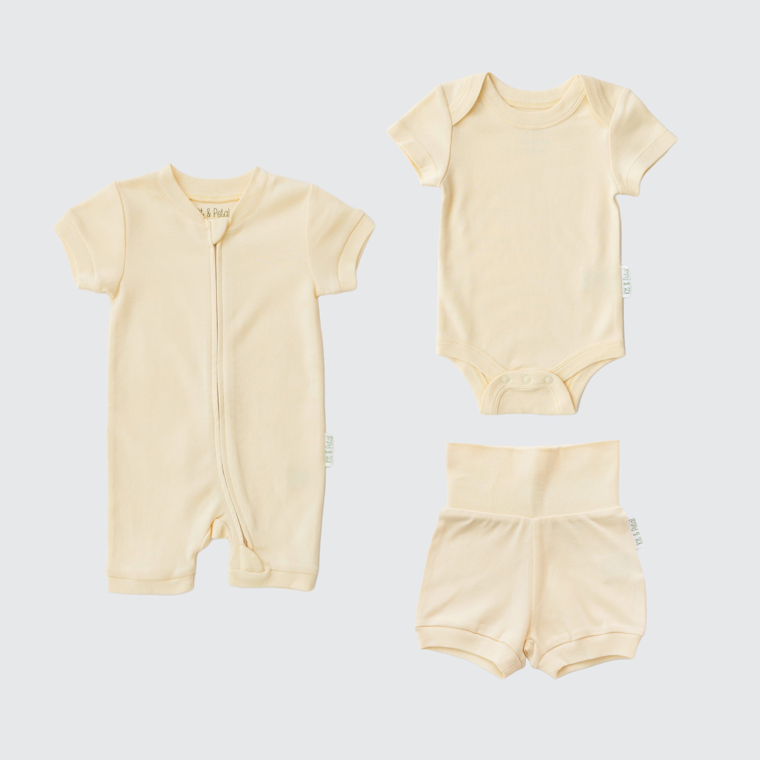 Sunny yellow organic cotton baby outfit set with short sleeve romper, short sleeve bodysuit, and fold-over shorts.