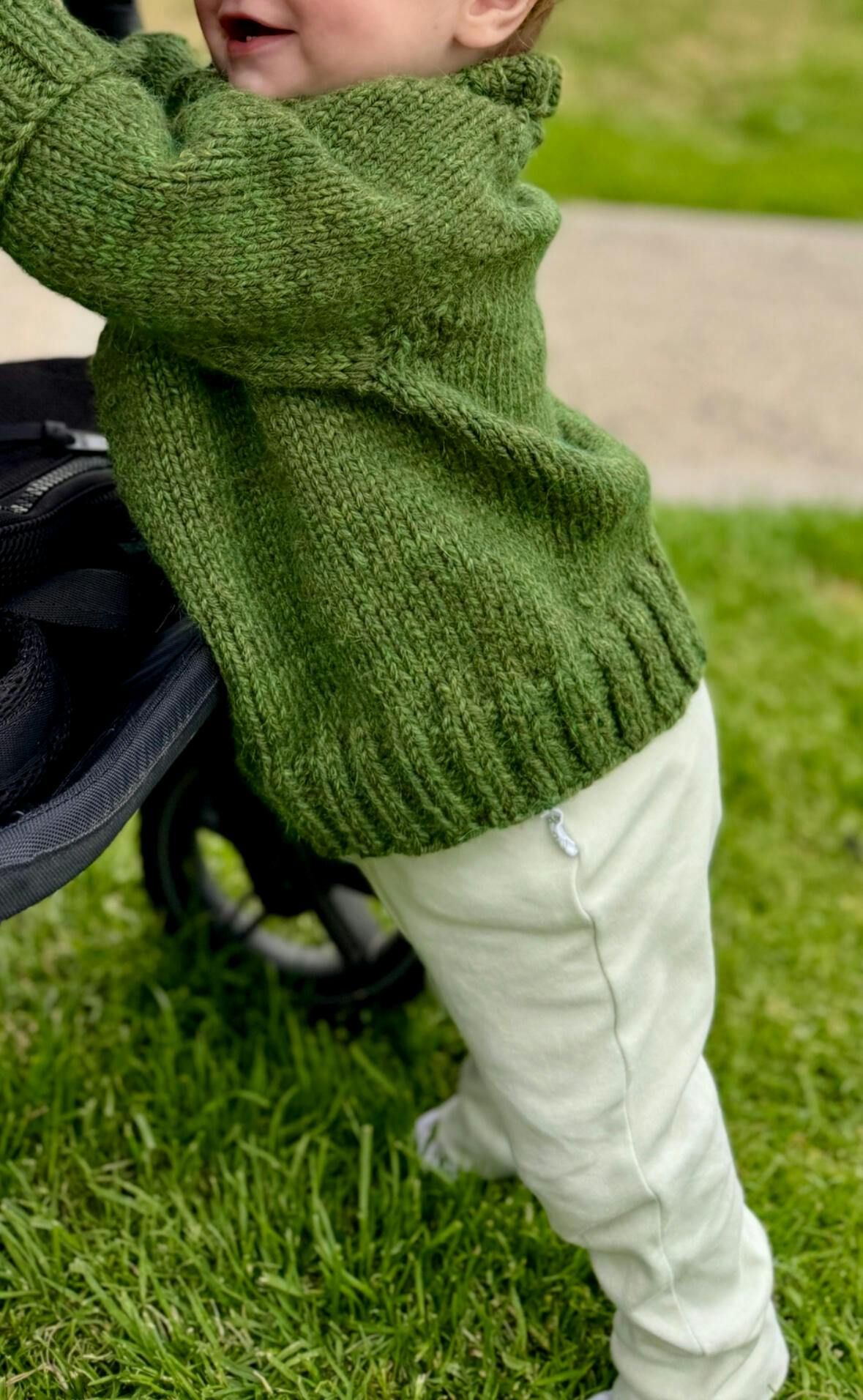 Baby wearing leafy green organic cotton fold-over pants and matching long sleeve shirt