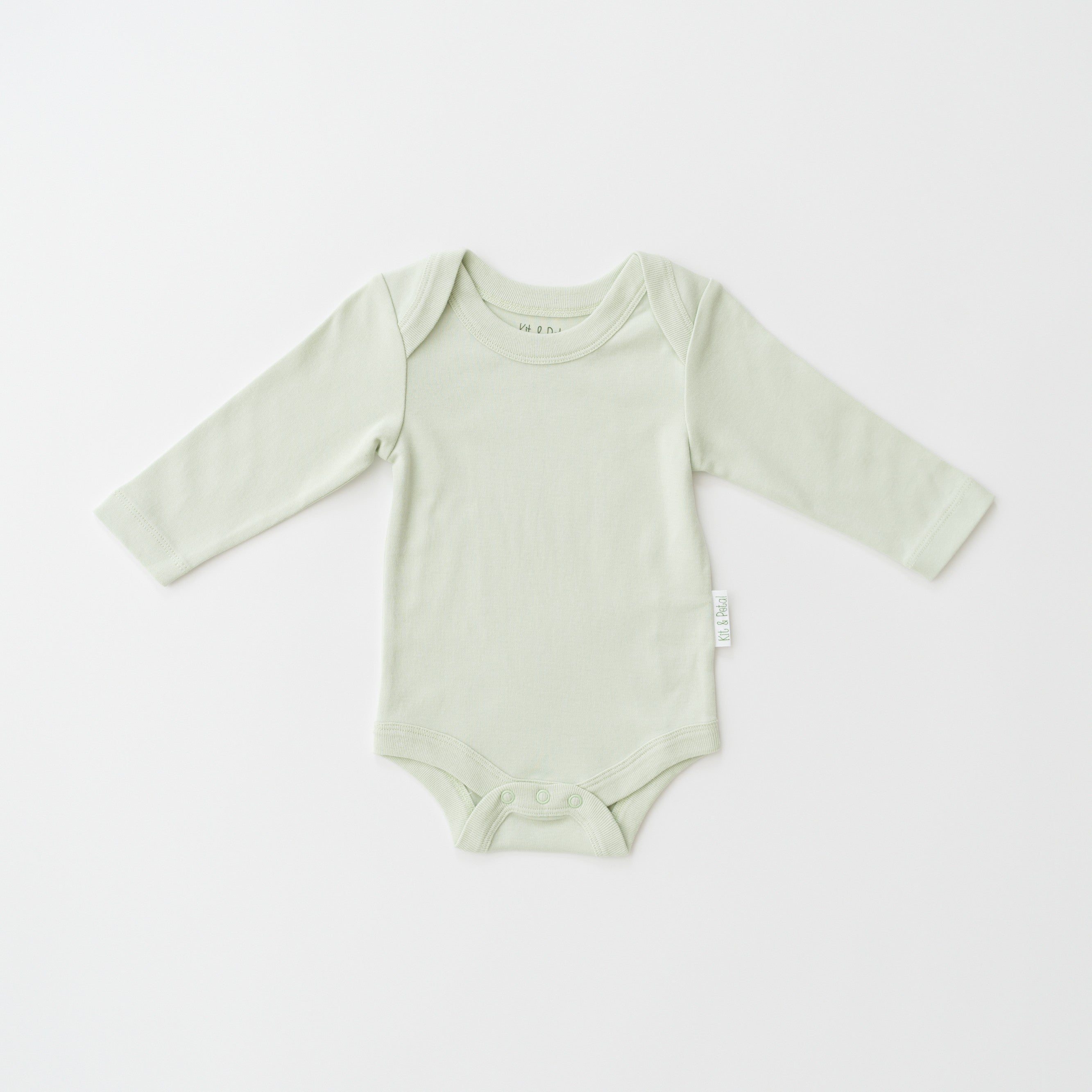 Close-up of snap buttons and Kit & Petal brand label on leafy green organic cotton baby short sleeve bodysuit