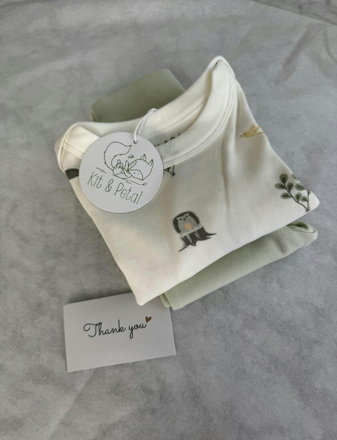 Close-up of Kit & Petal brand tag on Forest Friends organic cotton baby long sleeve shirt